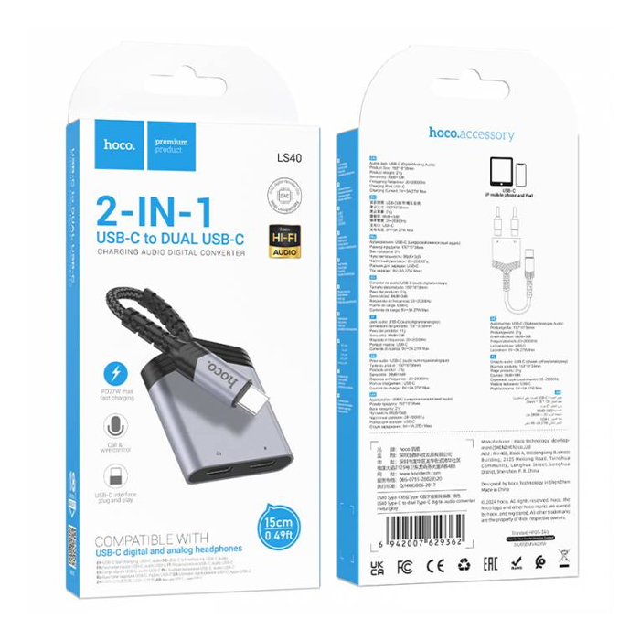 Переходник hoco ls39 type-c/2type-c серый