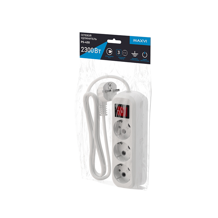 Сетевой удлинитель maxvi ps-430 2300вт (3 розеток) 3m белый