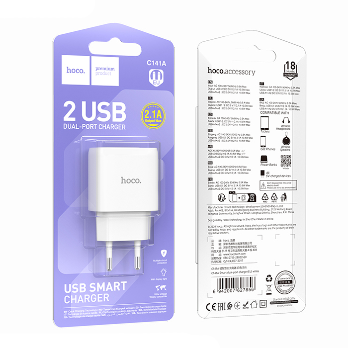 Сзу hoco c141a (2usb/2.1a) белое