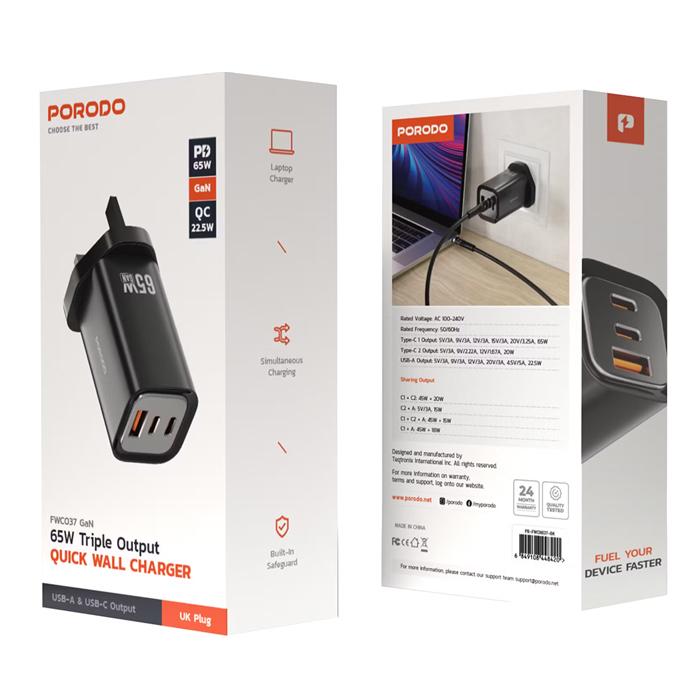 Азу porodo pd-fwch037-bk type-c/usb (36w/36w) черный